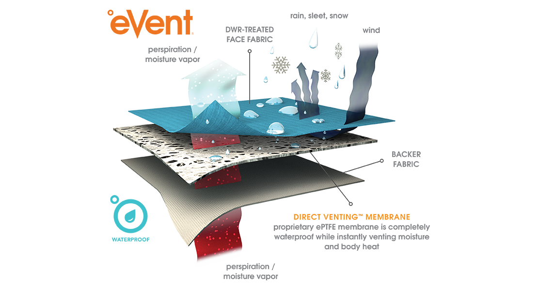 All of our jackets and waterproof masks are made with eVent® fabrics. The critical difference between this technology and traditional waterproof & breathable fabrics is the billions of microscopic pores built into the proprietary membrane that works instantly to vent water vapor (sweat) that builds inside.